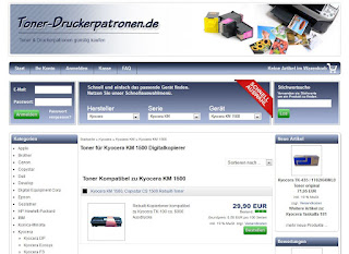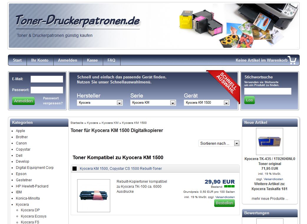 Dieser Online-Shop ist klar strukturiert und schön übersichtlich, so dass jeder sich hier schnell zurechtfindet. Man findet allerleit Toner- oder Druckerpatronen der einzelnen Hersteller links in der Kategorie-Liste oder aber direkt über das Schnellauswahlmenü, welches gegliedert ist in Hersteller, Serie und Gerät.