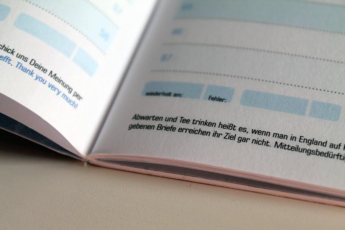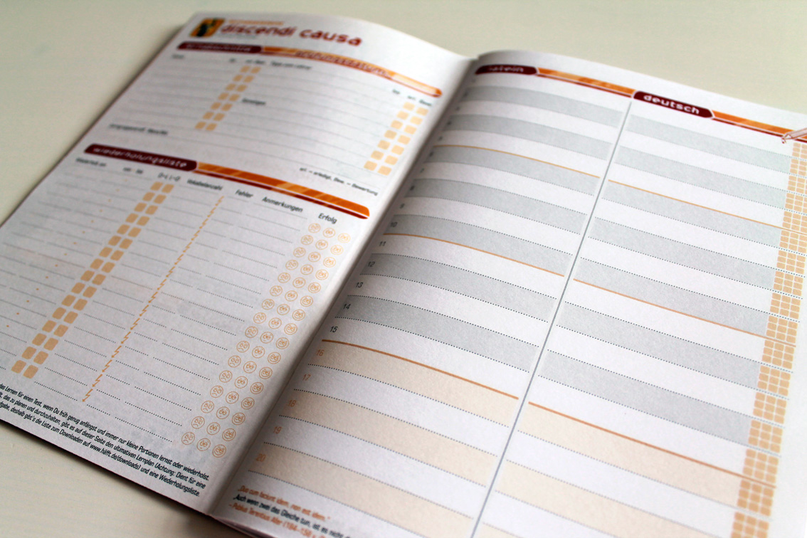 Wie alle Produkte sind auch die neuen Vokabel-Häffte (Universal, Englisch, Latein & Französisch) unheimlich gut durchdacht. Man kann seine Vokabeln nicht nur einfach niederschreiben, wie bei den meisten anderen handelsüblichen Vokabelheften, sondern auch die Kontrollen abhaken (9 Kästchen am Ende jeder Zeile). Unten auf der Seite kann man aufschreiben, wann man wieviele Fehler gemacht hat. Es gibt Seitenzahlen (in Deutsch und Englisch bzw. Latein) zum besseren Nachschlagen. Außerdem findet man ganz viel Kleingedrucktes mit interessanten, wichtigen oder unwichtigen, aber lustigen Informationen.
