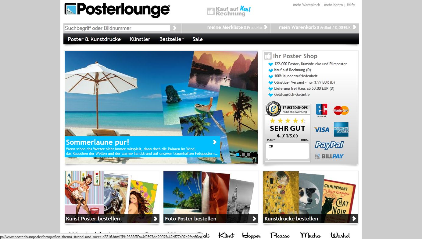 Posterlounge bietet eine unglaubliche Auswahl von 122.000 Postern, Kunstdrucken und Filmpostern. der Shop ist sehr übersichtlich gestaltet und unterteilt in folgende Hauptkategorien: Poster & Kunstdrucke, Künstler, Bestseller und Sale.