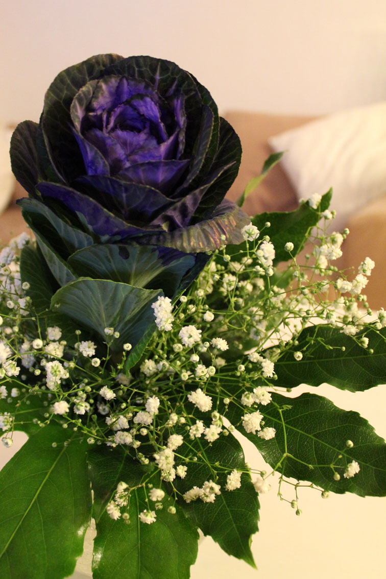 Das dachte ich mir, als ich zufällig an einem Blumenstand vorbeiging. Ich sah diesen wunderschönen Zierkohl und war so fasziniert, das ich mir gleich einen kleinen Strauss hab binden lassen und voilà jetzt steht er auf meinem Wohnzimmertisch.